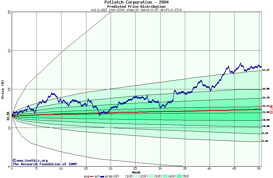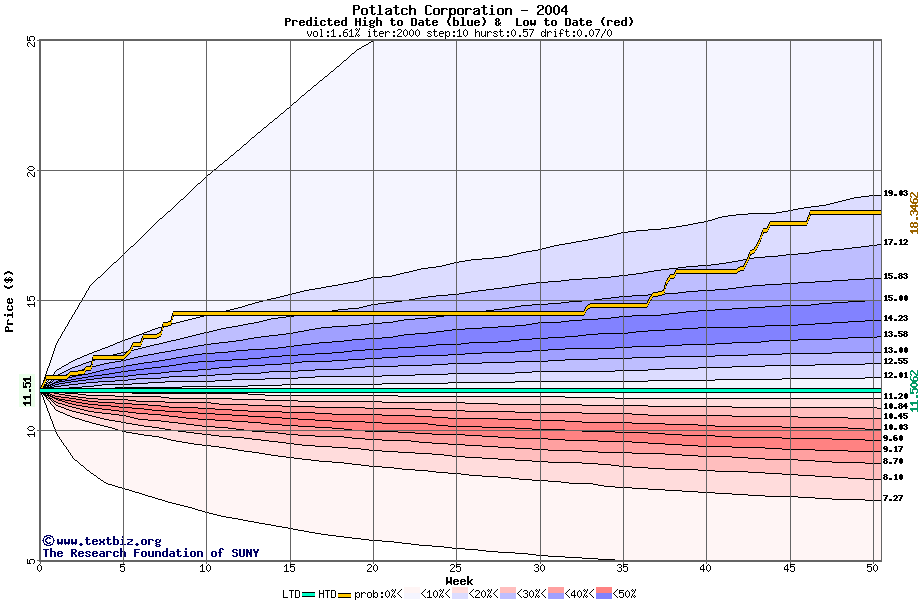 The following graph plots the year-to-date performance of the stock for 2004 compared to the probability calculated by a random walk model.