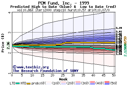 The high to date and low to date prices of the stock plotted against a random walk model for 1999 (what's this?).
