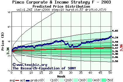 The high to date and low to date prices of the stock plotted against a random walk model for 2003 (what's this?).