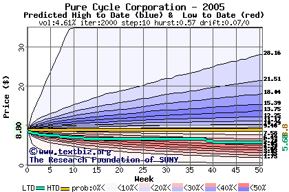 The high to date and low to date prices of the stock plotted against a random walk model for 2005 (what's this?).