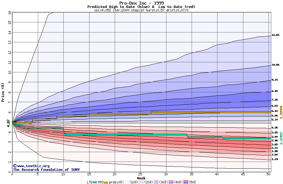 The high to date and low to date prices of the stock plotted against a random walk model for 1999 (what's this?).