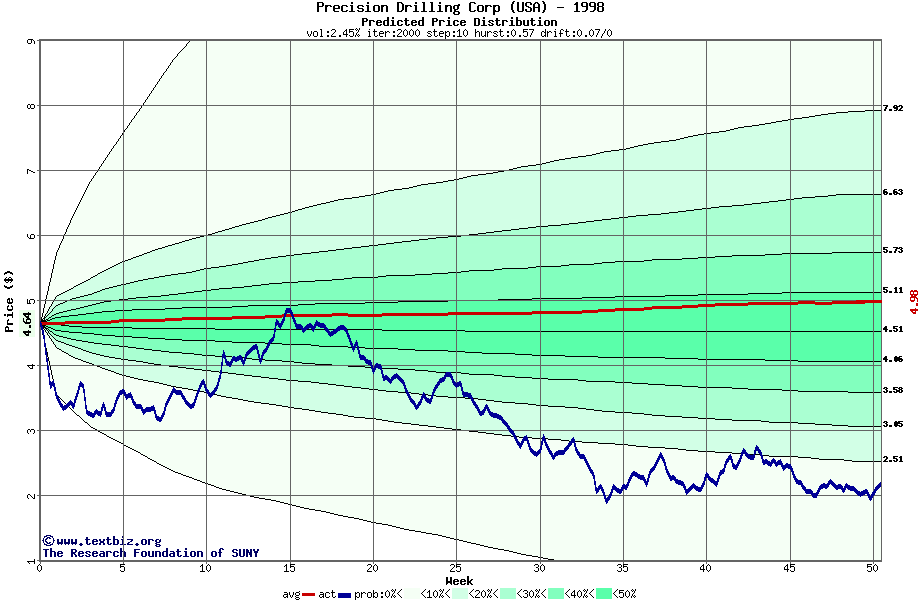 The following graph plots the year-to-date performance of the stock for 1998 compared to the probability calculated by a random walk model.