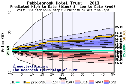 The high to date and low to date prices of the stock plotted against a random walk model for 2013 (what's this?).