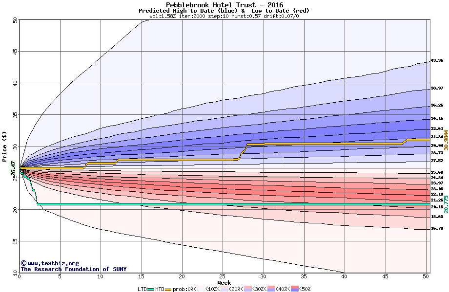 The high to date and low to date prices of the stock plotted against a random walk model for 2016 (what's this?).