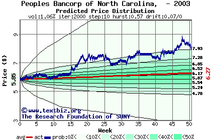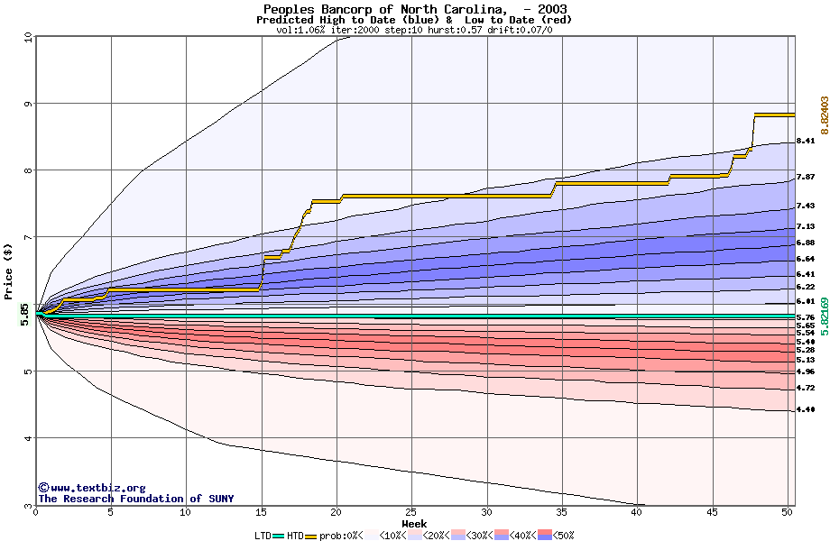 The high to date and low to date prices of the stock plotted against a random walk model for 2003 (what's this?).
