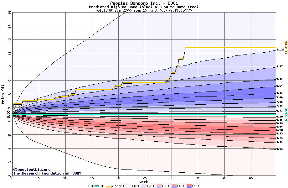 The high to date and low to date prices of the stock plotted against a random walk model for 2001 (what's this?).