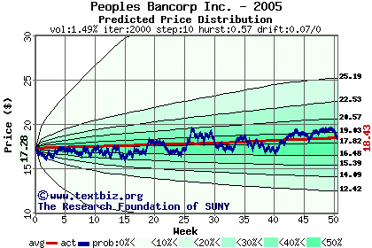 The following graph plots the year-to-date performance of the stock for 2005 compared to the probability calculated by a random walk model.
