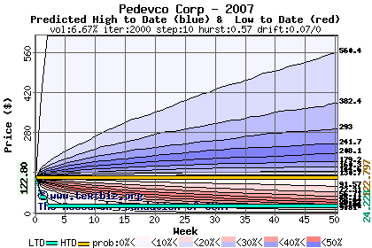 The high to date and low to date prices of the stock plotted against a random walk model for 2007 (what's this?).