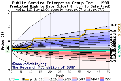 The high to date and low to date prices of the stock plotted against a random walk model for 1998 (what's this?).