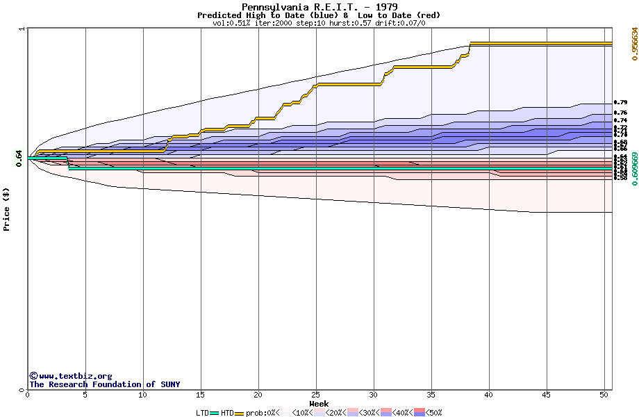 The high to date and low to date prices of the stock plotted against a random walk model for 1979 (what's this?).