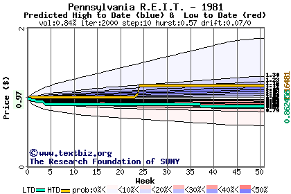 The high to date and low to date prices of the stock plotted against a random walk model for 1981 (what's this?).