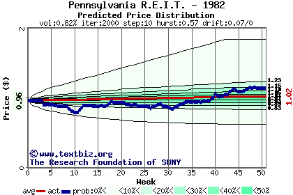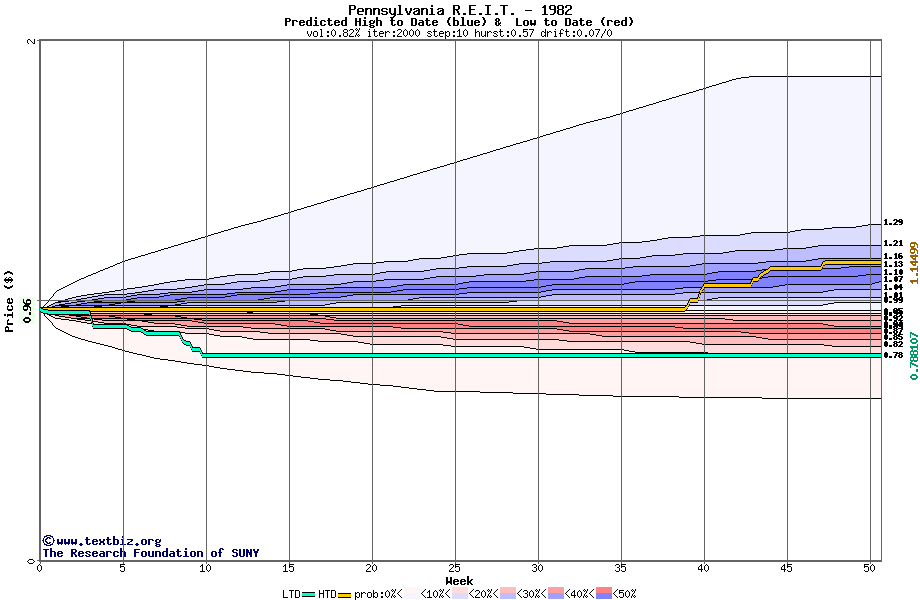 The high to date and low to date prices of the stock plotted against a random walk model for 1982 (what's this?).