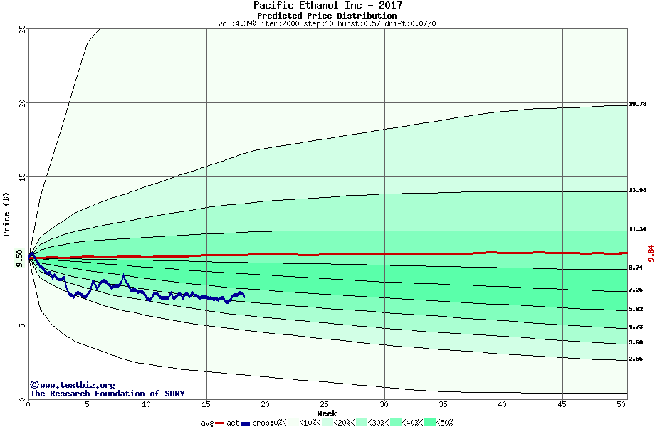 The high to date and low to date prices of the stock plotted against a random walk model for 2017 (what's this?).