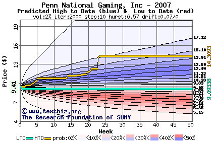 The high to date and low to date prices of the stock plotted against a random walk model for 2007 (what's this?).