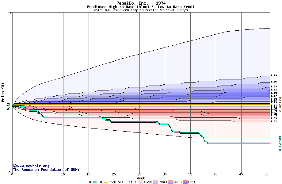 The high to date and low to date prices of the stock plotted against a random walk model for 1974 (what's this?).