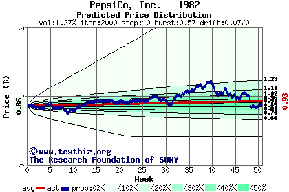 The high to date and low to date prices of the stock plotted against a random walk model for 1982 (what's this?).