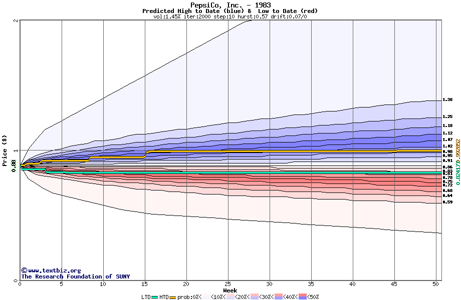 The high to date and low to date prices of the stock plotted against a random walk model for 1983 (what's this?).