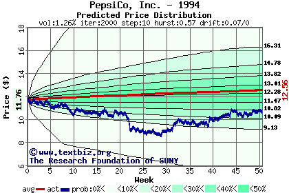 The high to date and low to date prices of the stock plotted against a random walk model for 1994 (what's this?).