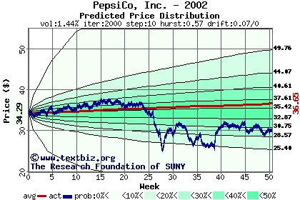The following graph plots the year-to-date performance of the stock for 2002 compared to the probability calculated by a random walk model.