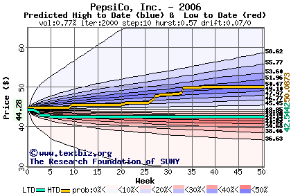 The high to date and low to date prices of the stock plotted against a random walk model for 2006 (what's this?).