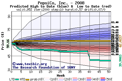 The high to date and low to date prices of the stock plotted against a random walk model for 2008 (what's this?).