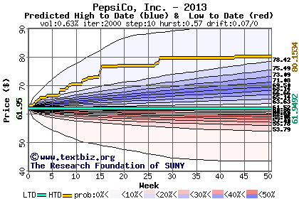 The high to date and low to date prices of the stock plotted against a random walk model for 2013 (what's this?).