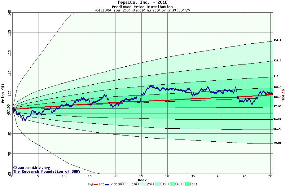 The following graph plots the year-to-date performance of the stock for 2016 compared to the probability calculated by a random walk model.