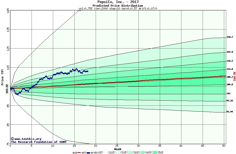 The following graph plots the year-to-date performance of the stock for 2017 compared to the probability calculated by a random walk model.