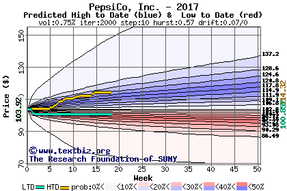 The high to date and low to date prices of the stock plotted against a random walk model for 2017 (what's this?).