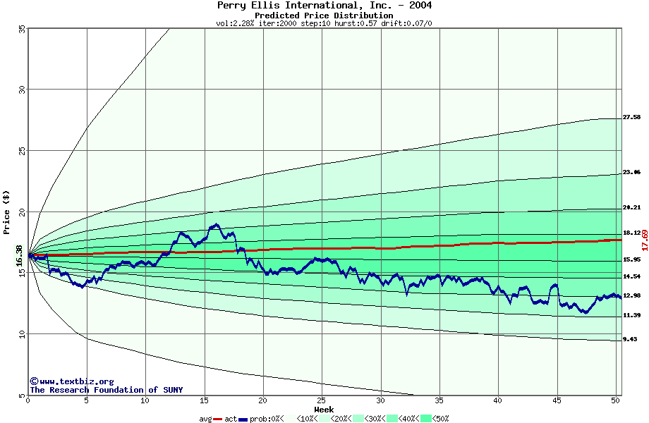 The following graph plots the year-to-date performance of the stock for 2004 compared to the probability calculated by a random walk model.