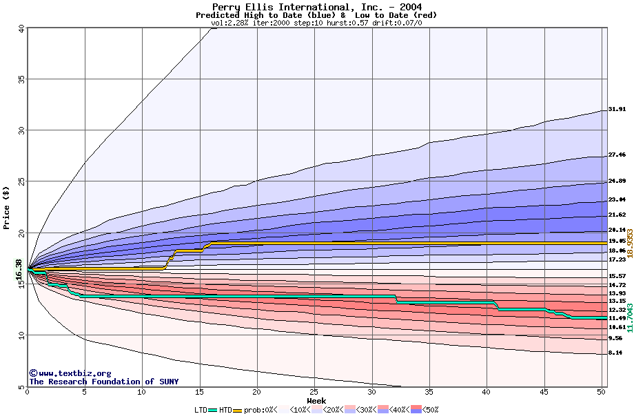 The high to date and low to date prices of the stock plotted against a random walk model for 2004 (what's this?).