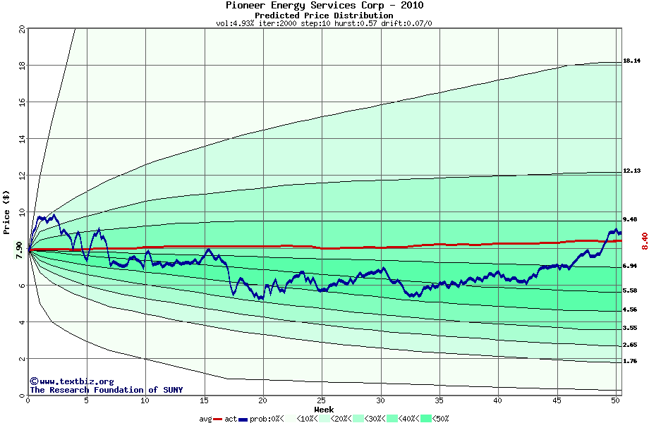 The following graph plots the year-to-date performance of the stock for 2010 compared to the probability calculated by a random walk model.