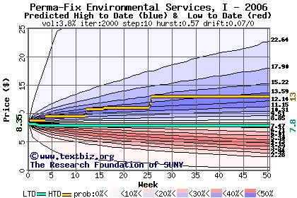 The high to date and low to date prices of the stock plotted against a random walk model for 2006 (what's this?).