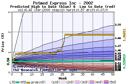 The high to date and low to date prices of the stock plotted against a random walk model for 2002 (what's this?).