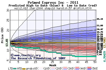 The high to date and low to date prices of the stock plotted against a random walk model for 2011 (what's this?).
