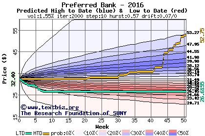 The high to date and low to date prices of the stock plotted against a random walk model for 2016 (what's this?).