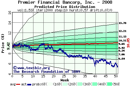 The high to date and low to date prices of the stock plotted against a random walk model for 2008 (what's this?).