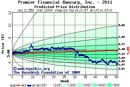 The high to date and low to date prices of the stock plotted against a random walk model for 2011 (what's this?).