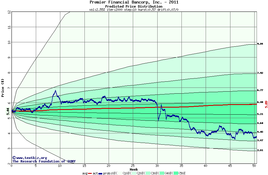 The following graph plots the year-to-date performance of the stock for 2011 compared to the probability calculated by a random walk model.