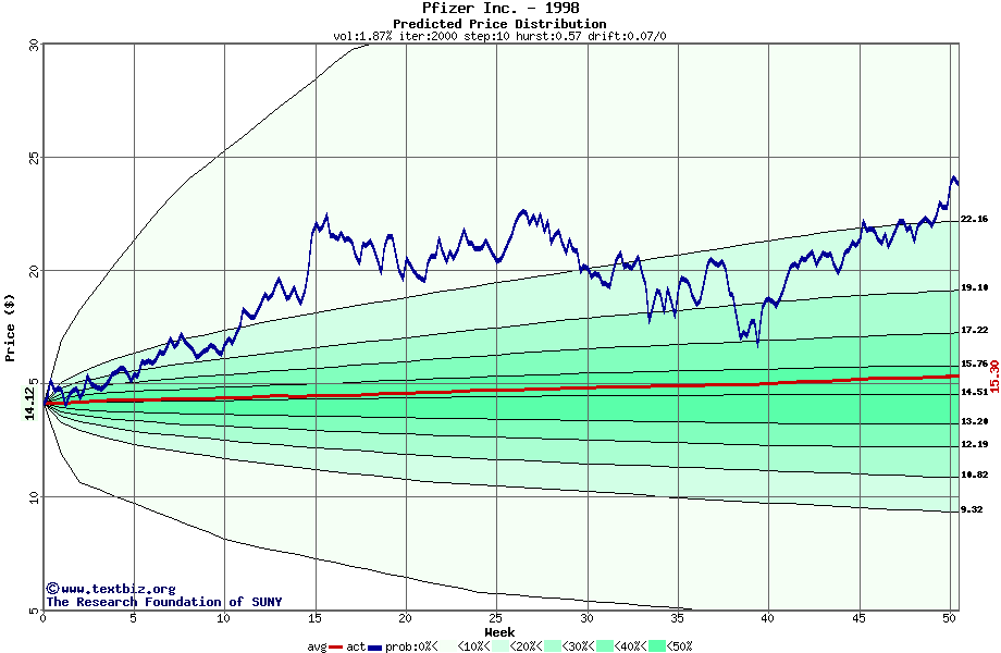 The following graph plots the year-to-date performance of the stock for 1998 compared to the probability calculated by a random walk model.