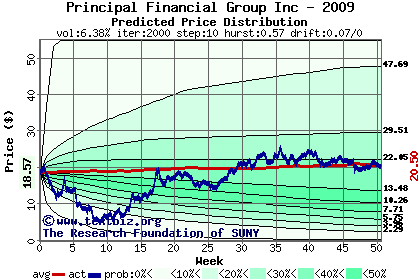 The high to date and low to date prices of the stock plotted against a random walk model for 2009 (what's this?).