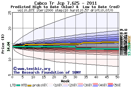 The high to date and low to date prices of the stock plotted against a random walk model for 2011 (what's this?).