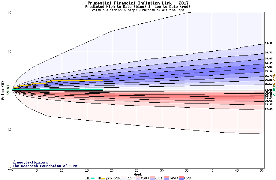 The high to date and low to date prices of the stock plotted against a random walk model for 2017 (what's this?).