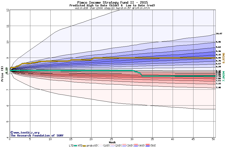 The high to date and low to date prices of the stock plotted against a random walk model for 2015 (what's this?).