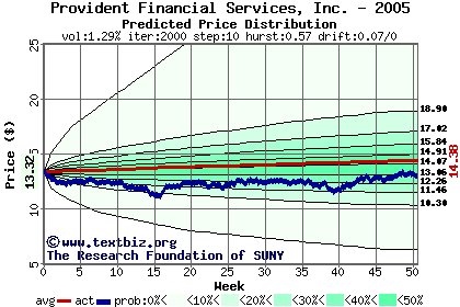 The following graph plots the year-to-date performance of the stock for 2005 compared to the probability calculated by a random walk model.