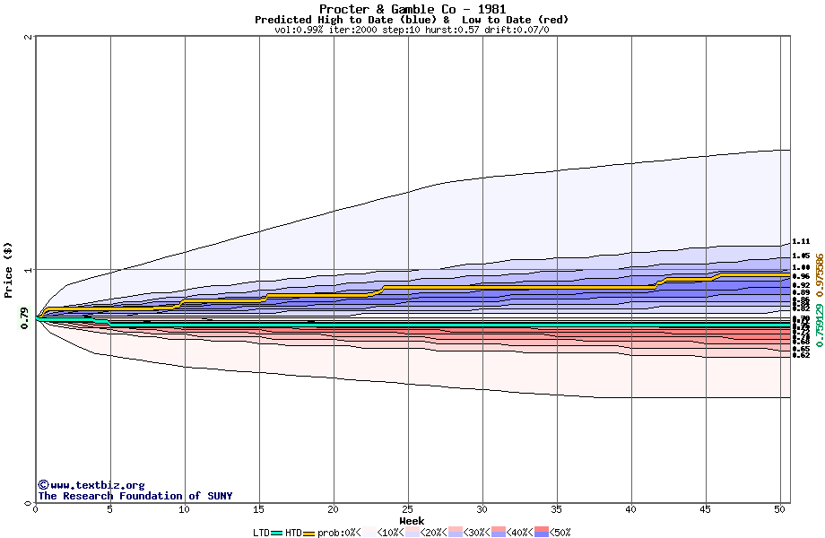 The high to date and low to date prices of the stock plotted against a random walk model for 1981 (what's this?).