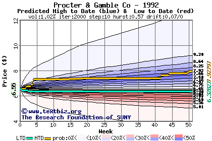 The high to date and low to date prices of the stock plotted against a random walk model for 1992 (what's this?).