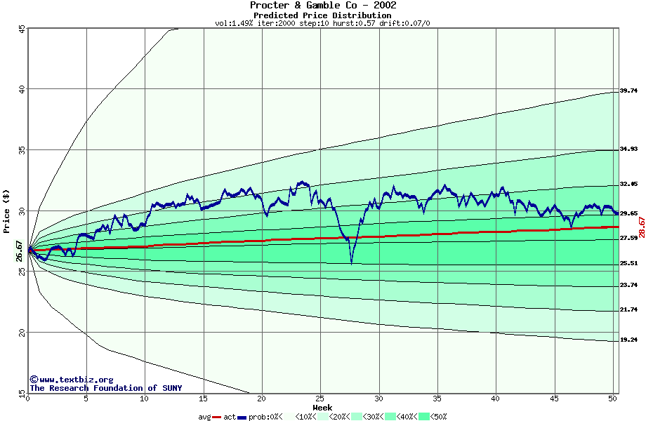 The following graph plots the year-to-date performance of the stock for 2002 compared to the probability calculated by a random walk model.