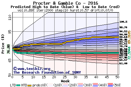 The high to date and low to date prices of the stock plotted against a random walk model for 2016 (what's this?).