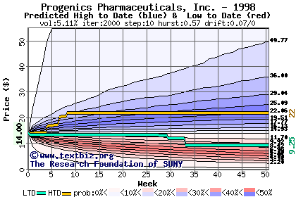 The high to date and low to date prices of the stock plotted against a random walk model for 1998 (what's this?).